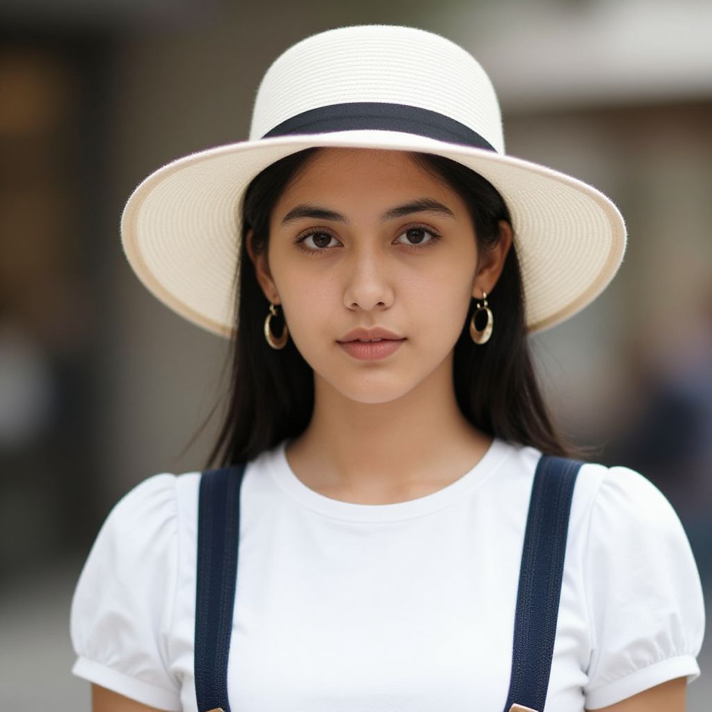 Encanto costume adult, 1girl, solo, hat, earrings, blurry background, jewelry, blurry, suspenders, shirt, looking at viewer, short sleeves, realistic, outdoors, upper body, black hair, white shirt, puffy short sleeves, puffy sleeves, brown eyes