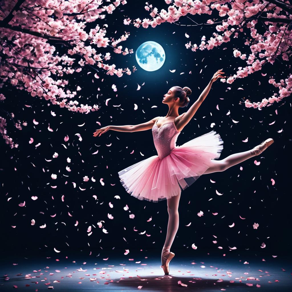 A ballerina in a sparkling blue tutu striking an elegant arabesque pose on pointe. She is set against a dramatic stormy sky illuminated by multiple bolts of lightning and heavy rain, creating a mysterious and powerful atmosphere.