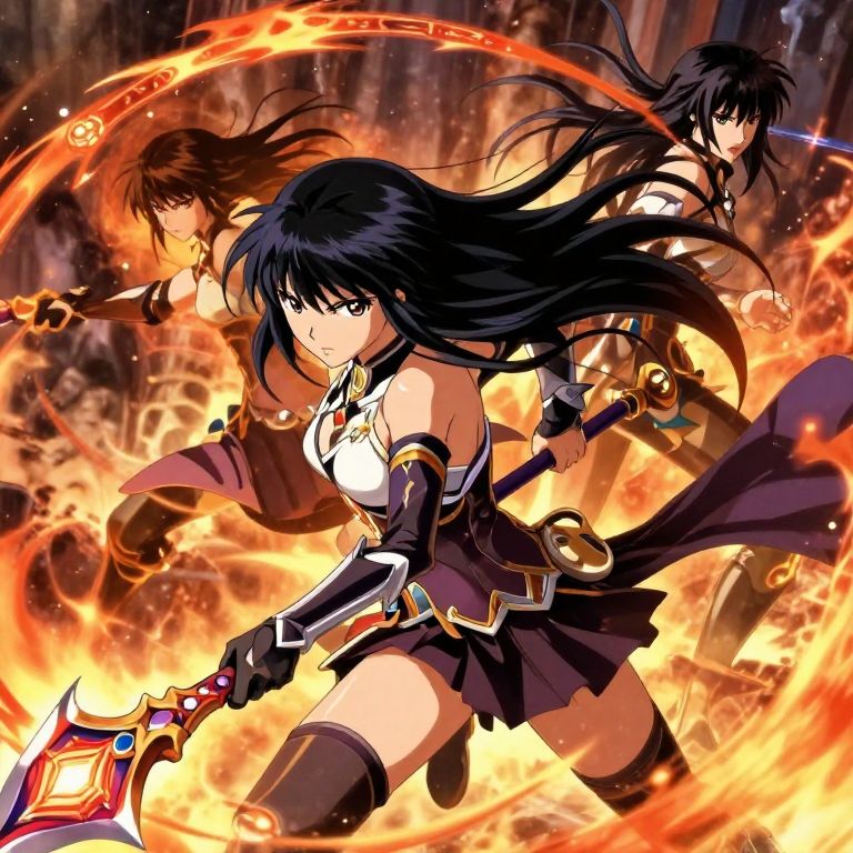 Anime females with black hair in a fantasy battle scene, armored outfit with intricate designs, wielding a magical staff with glowing runes, dynamic motion with flowing hair, fiery and smoky battlefield background, intense and powerful atmosphere, vivid color palette