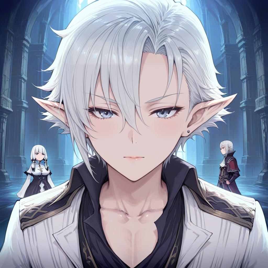 Astarion, baldur's gate, 1boy, red eyes, short hair, white hair, grey hair, white shirt, vampire, elf, by artist haoni, illustrious