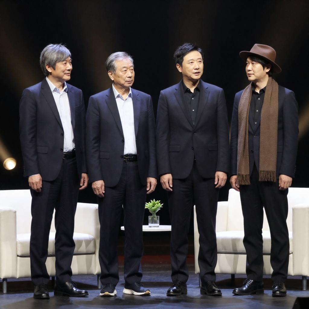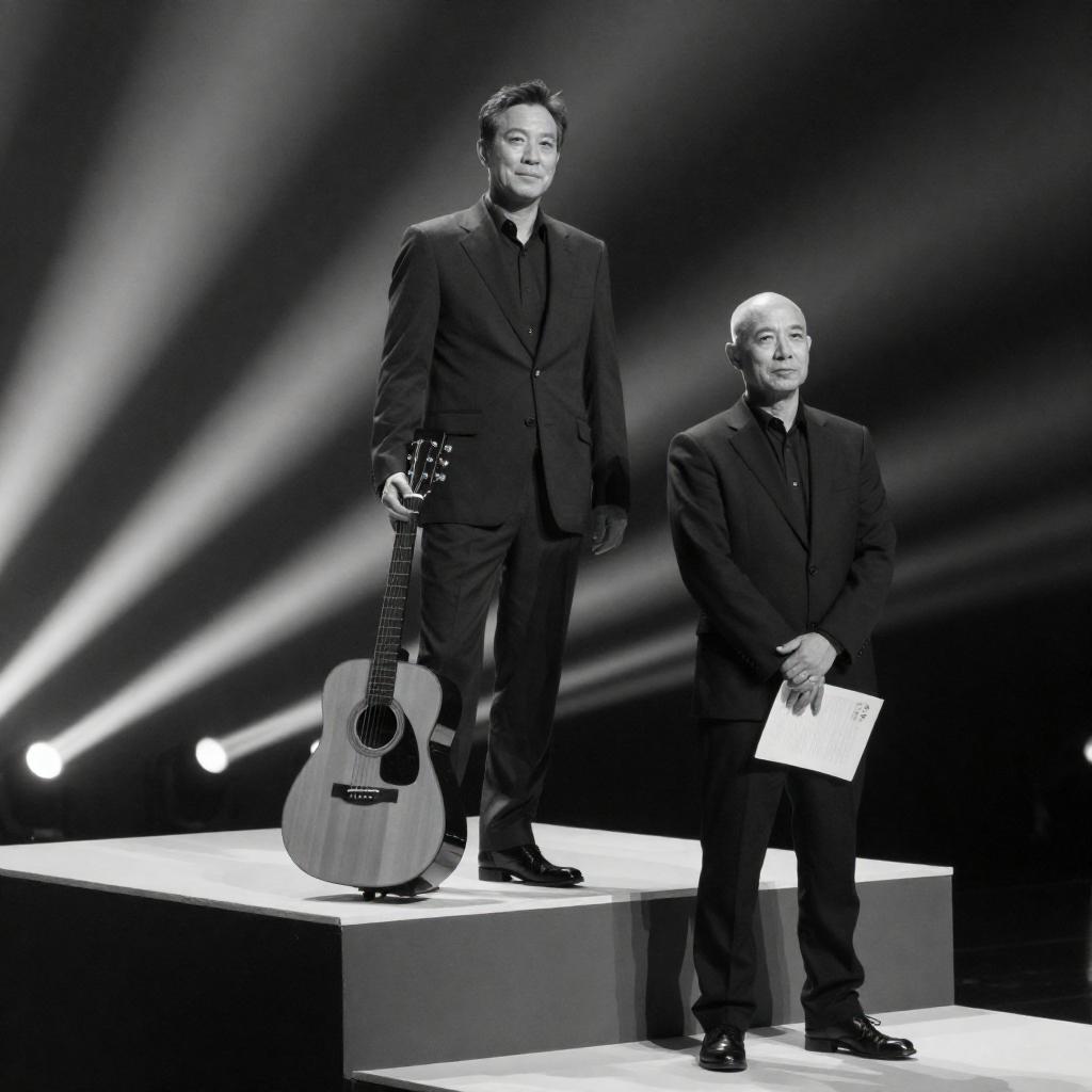 Black and white photograph of two men. Tall man in dark suit, holding guitar, standing on left. Shorter man in dark suit, with bald head, holding papers, standing on right. Both looking at camera. Dynamic light streaks in background. Tall man on raised platform, shorter man on lower platform.