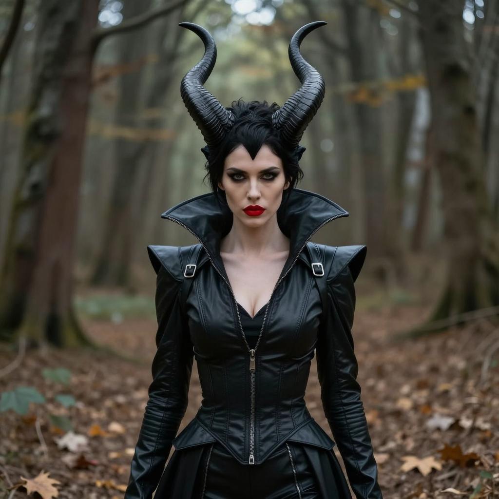 A woman dressed in a dramatic black leather outfit with high, pointed collar and large, curved horns on her head stands confidently in a leaf-strewn forest. Her striking red lips and intense gaze complement the dark, fantasy-inspired style of the image.