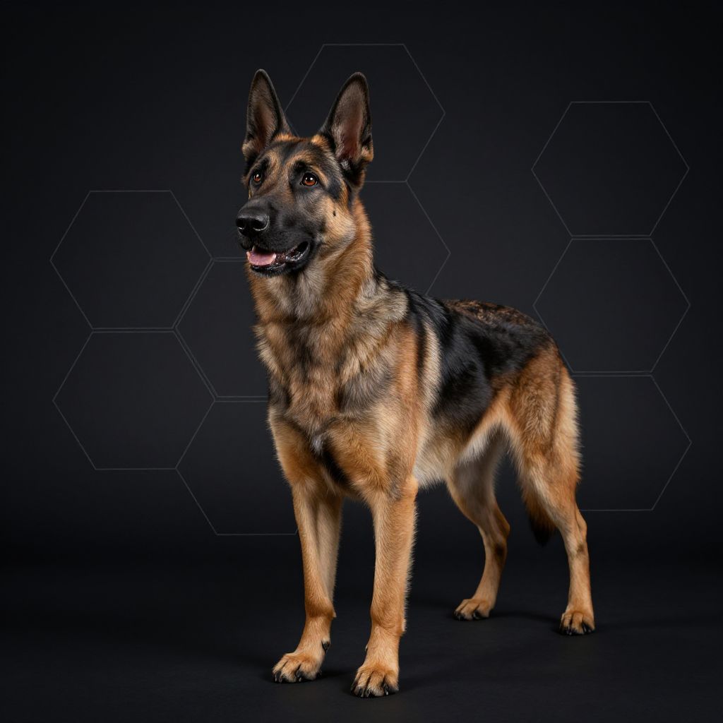 Photograph of a German Shepherd standing on a dark hexagon-patterned background, showcasing its brown, black, and tan fur, alert ears, and