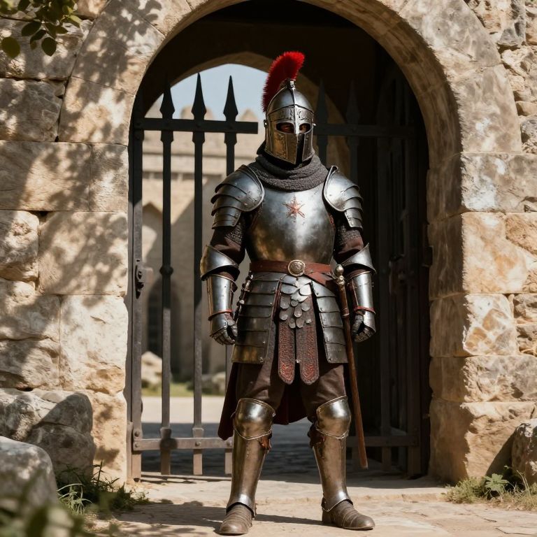 Legionnaire standing guard at ancient fortress gate, detailed stone walls and iron portcullis behind, intense gaze beneath bronze helmet with red crest, sunlight filtering through trees casting shadows on battle-worn armor, epic historical fantasy style.