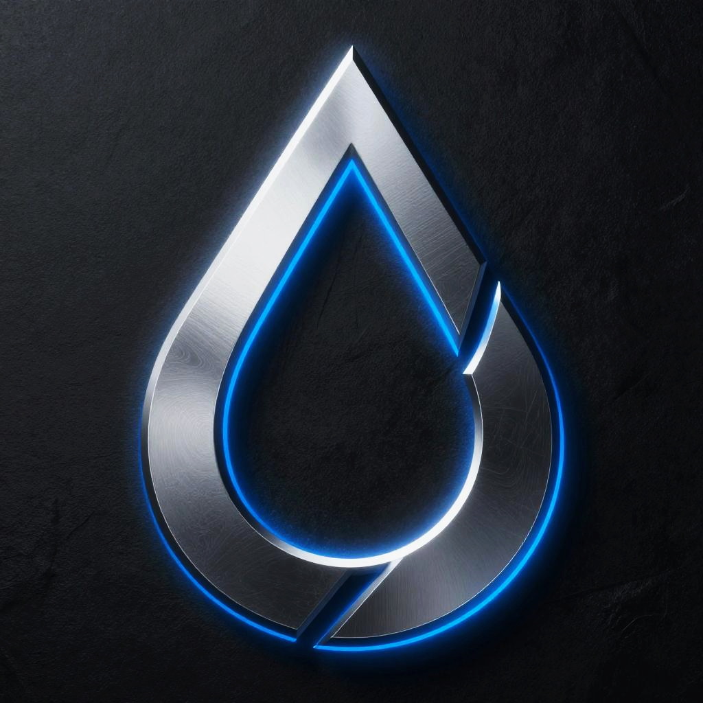 Photograph of a metallic water droplet logo with blue neon outline on a black textured background, featuring a futuristic and sleek design.