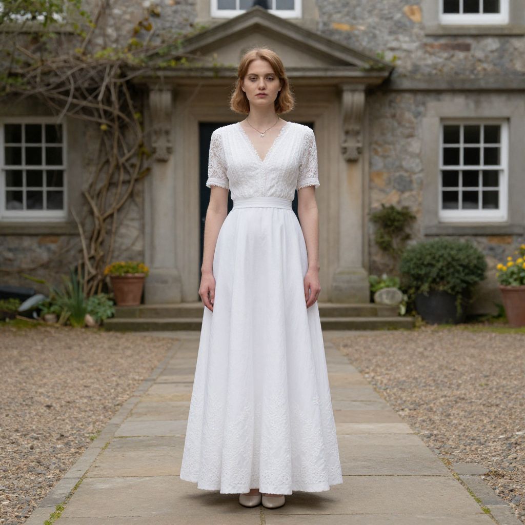 Photograph of a fair-skinned woman with wavy brown hair standing on a stone path in front of a stone mansion with ivy and potted plants. She wears a white, knee-length, lace wedding dress with short sleeves and a V-neck. Her expression is neutral, and she stands with her hands relaxed by her sides. The mansion has large, white-framed windows and a central door with stone columns. The gravel garden and overcast sky add a rustic, serene ambiance to the scene.