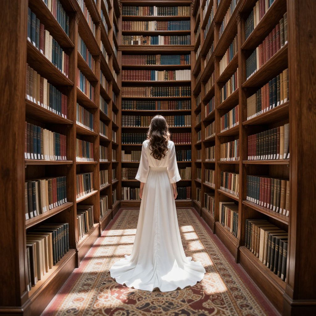A woman in a flowing white gown stands at the center of a grand, sunlit library aisle, surrounded by towering wooden shelves filled with countless leather-bound books, their spines casting intricate shadows on the ornate carpet beneath her.