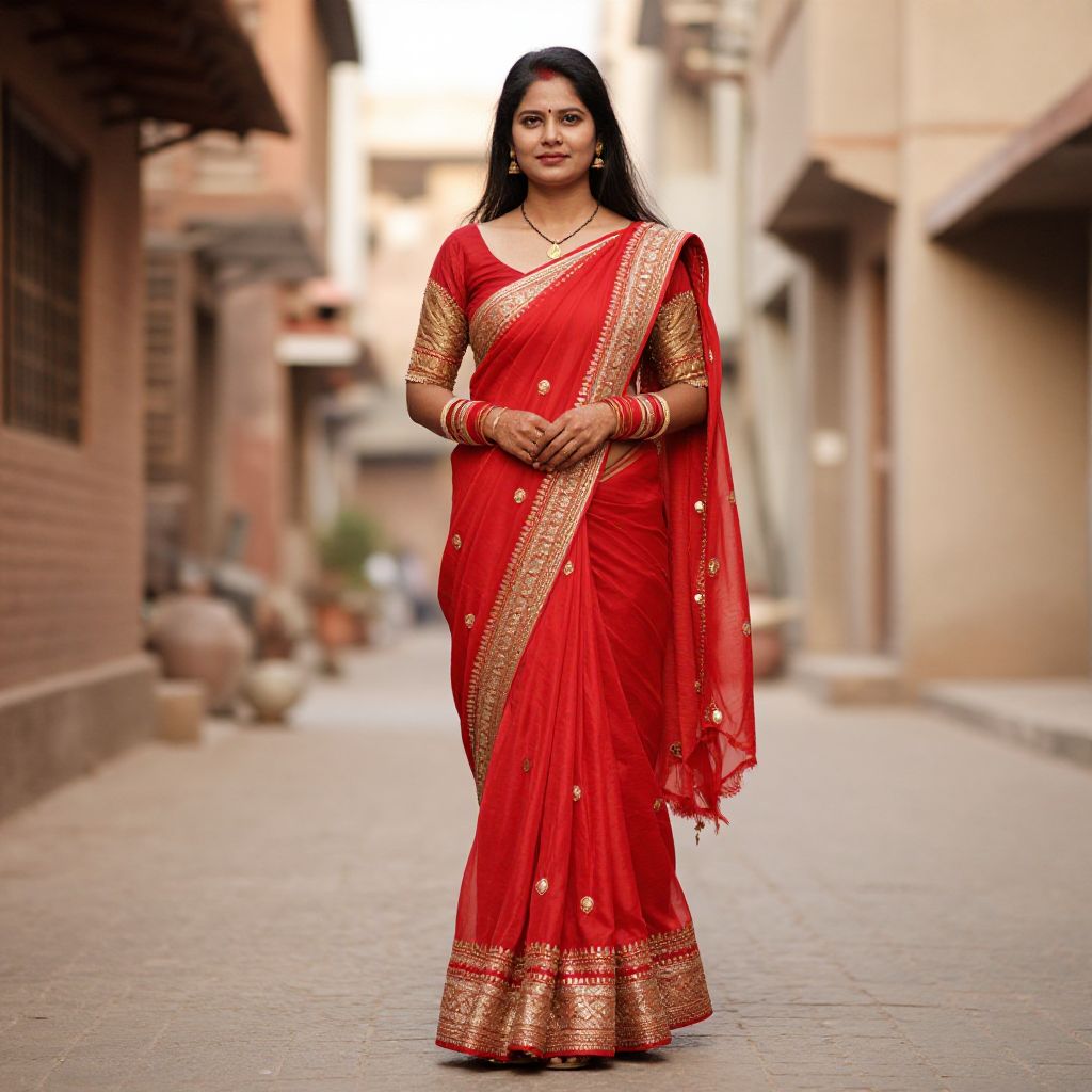 Traditional Indian Woman Clothing Costume, woman in red sari standing in alley with buildings in background