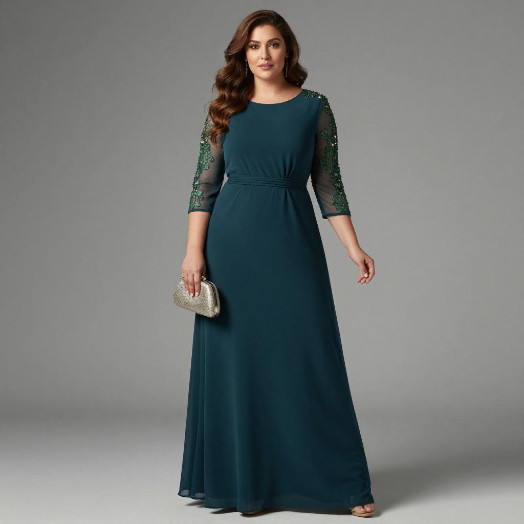 Photograph of a curvy woman with long, wavy brown hair wearing a floor-length, dark teal gown with sheer, green-gold embroidered sleeves and a cinched waist. She holds a small, metallic clutch in her right hand, standing against a softly lit, gray background.