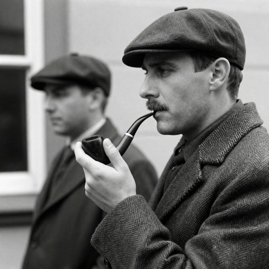 Black-and-white photograph of two men in profile. Foreground man, wearing a flat cap and herringbone coat, holds a curved pipe. Background man, also in a flat cap, looks to the side. Both have mustaches. Background includes a window.