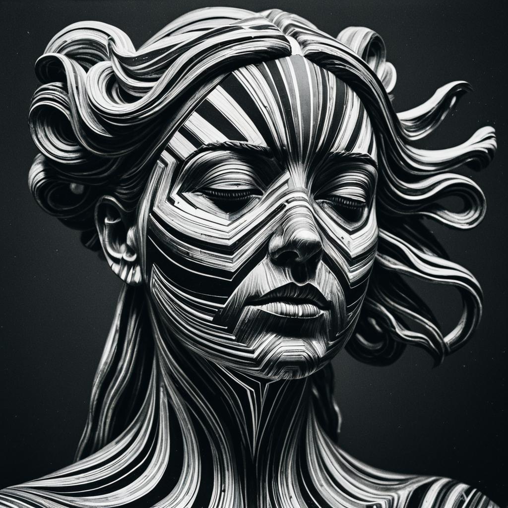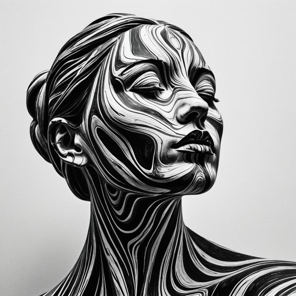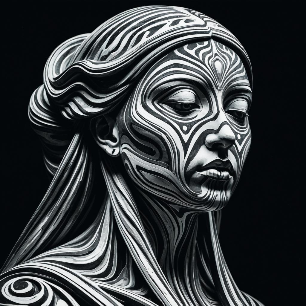 A female head sculpture inspired by an ancient statue, in the style of psychedelic abstraction, solarization effect, hyperrealistic illustrations, fluid and flowing lines, intricate body-painting, cosmic mythology.