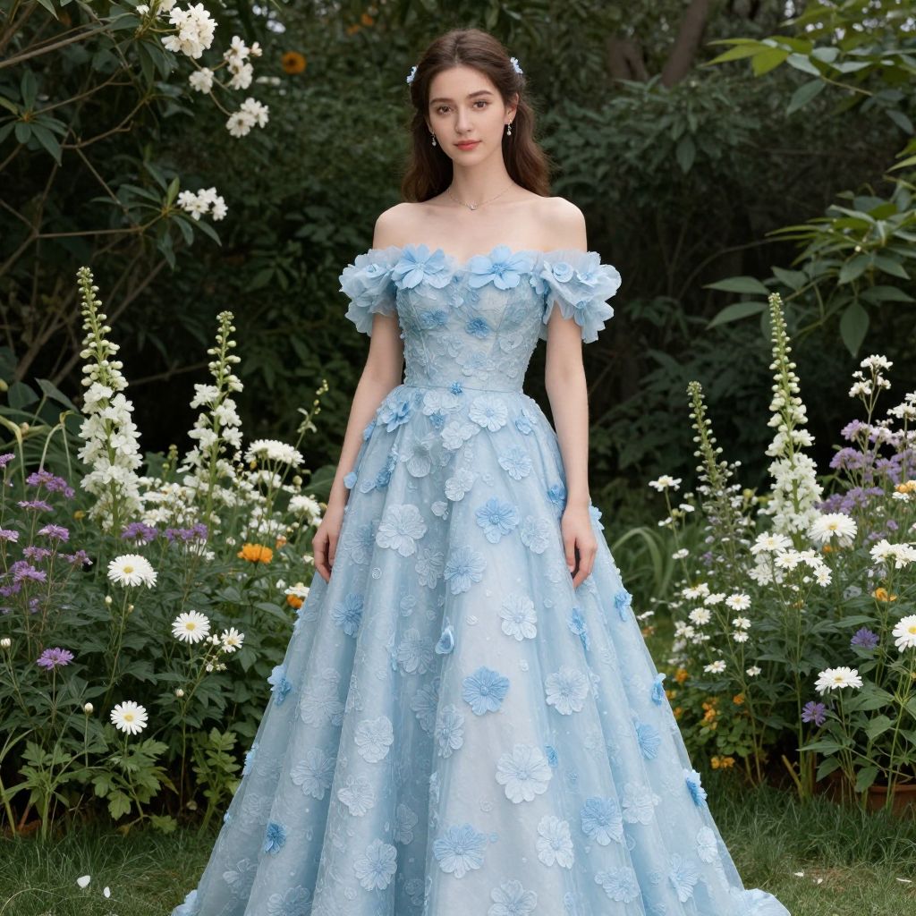 Princess Flower Dress, a woman in a blue dress standing in front of flowers