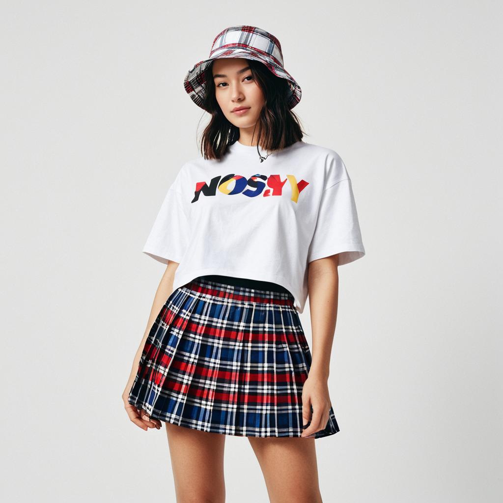 Woman, street style, oversized graphic t-shirt in white with multicolored abstract print, crew neck, drop shoulder, short sleeves, paired with a plaid mini skirt in red, blue, and white, pleated, bucket hat in black, white background.