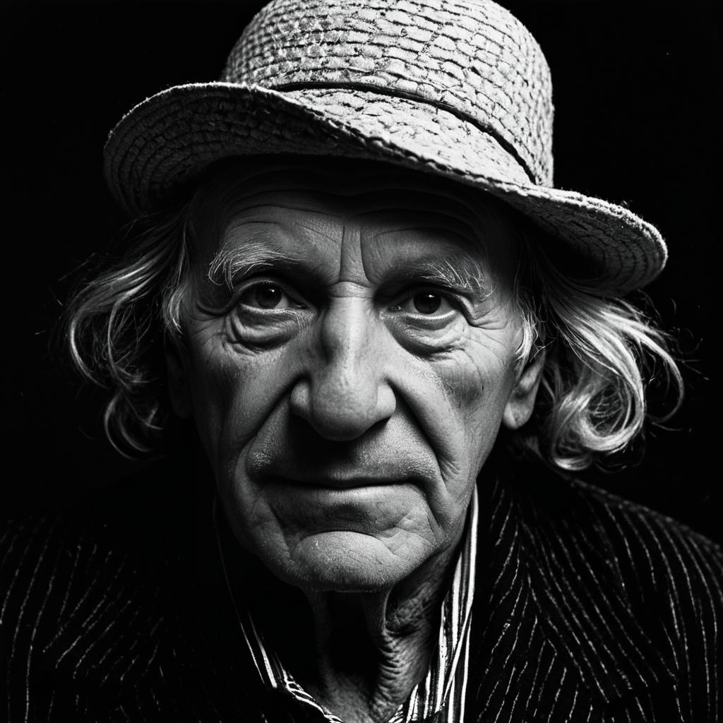 Black and white high contrast studio close-up portrait of a wrinkled elderly man wearing a textured hat, with deep facial lines and clear eyes looking directly into the camera. The subject has long hair peeking from under the hat and wears a striped shirt with a dark pinstriped jacket. The image features dramatic lighting with a dark background, emphasizing the man's intense and contemplative expression.