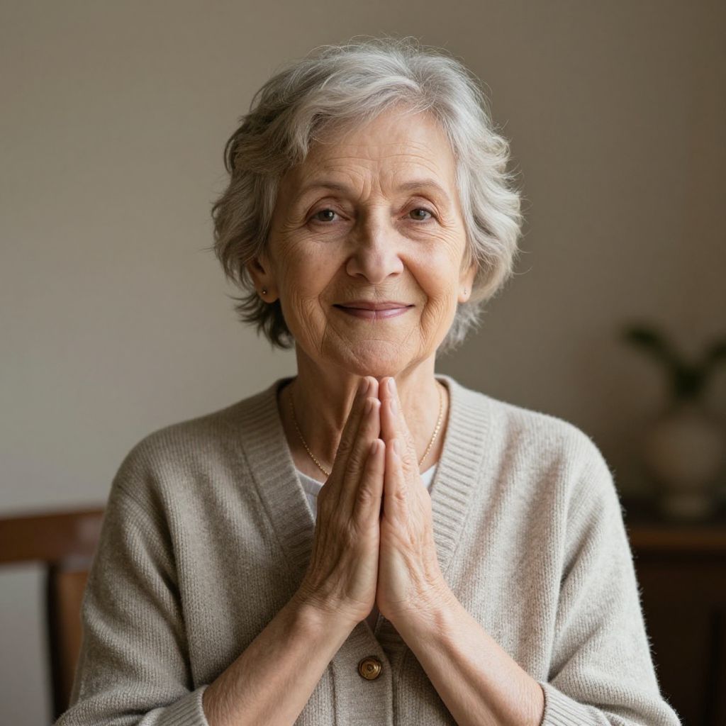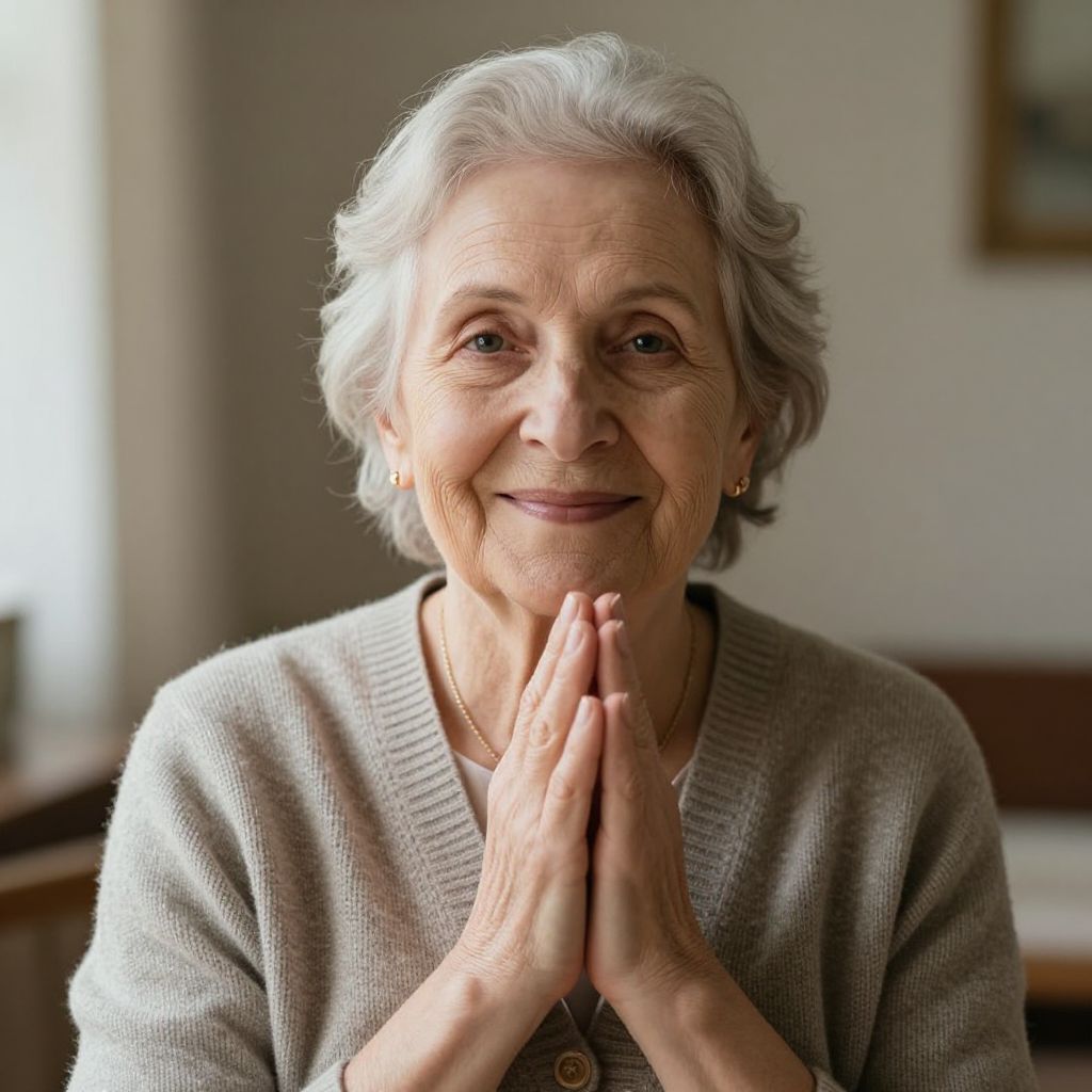 Radiant serenity and timeless wisdom emanate from an elderly woman's gentle smile, her folded hands a quiet testament to a life rich with stories and enduring grace.