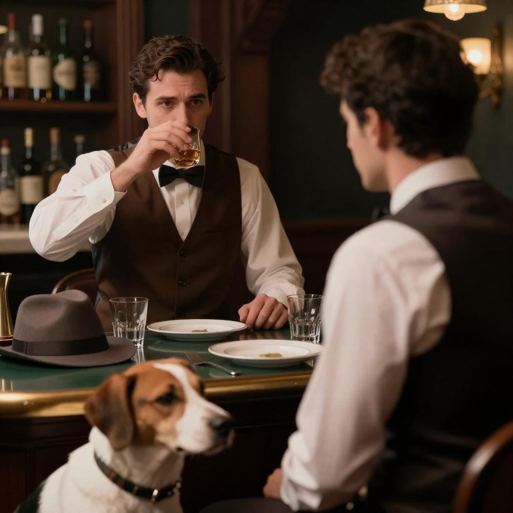Photograph of a dimly lit bar with wooden ceiling and ornate chandeliers. Two men in red vests, one older with gray hair and the other younger, are at the bar counter. Barkeeper in red vest pours drink. Several patrons sit and stand in background. Bar counter has illuminated shelves with bottles. Smoky atmosphere.
