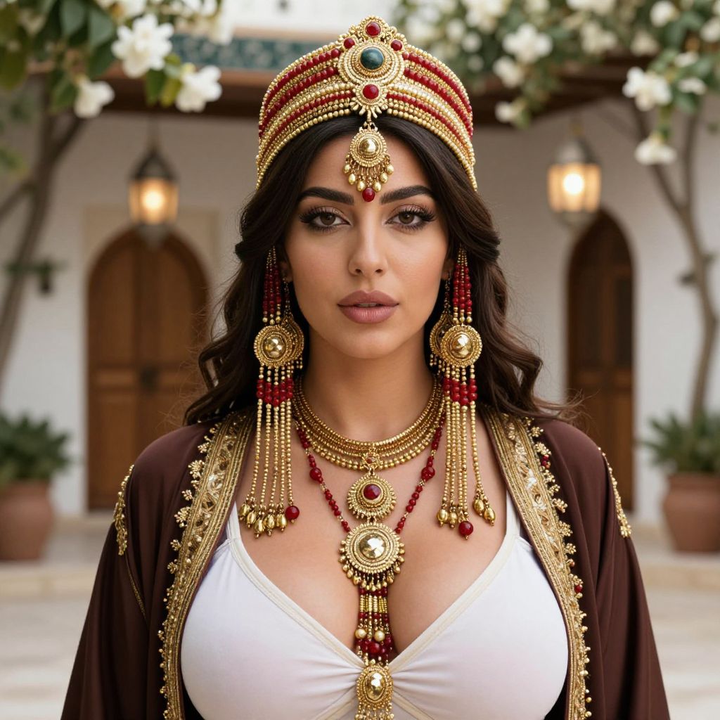 Photograph of a stunning woman with medium tan skin and long, dark wavy hair. She wears a rich, ornate headpiece adorned with red and gold jewels, matching large earrings, and a detailed necklace with red beads and gold accents over a white, low-cut top that highlights her ample cleavage. Her dark eyes are accentuated with bold makeup. She has a brown, gold-embroidered shawl draped over her shoulders. The background features a blurred, sunlit courtyard with white walls, wooden doors, and potted plants, evoking a Mediterranean or Middle Eastern setting. The image is sharp and vibrant, focusing on her regal, exotic appearance.