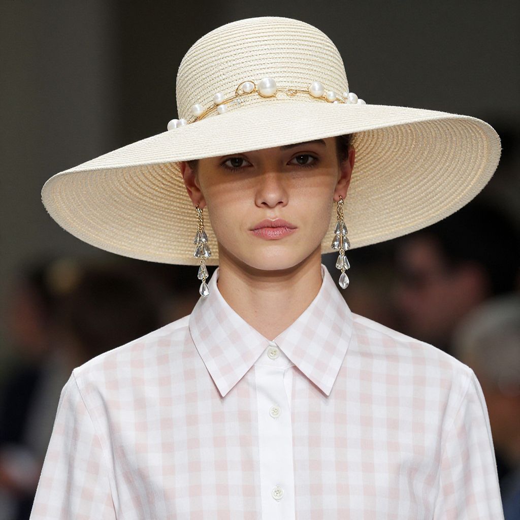 Model showcasing a Mulberry Spring 2014 collection ensemble, featuring a wide-brimmed cream straw hat adorned with pearl embellishments, paired with a crisp white and pink gingham shirt and complemented by dangling crystal earrings.