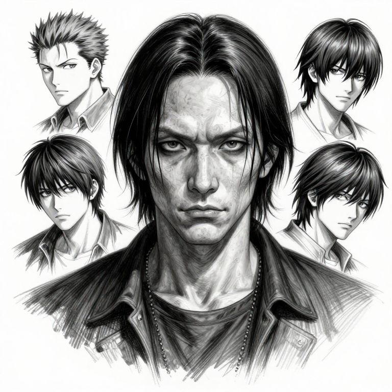 This is a black and white digital drawing featuring six stylized portraits of a young man with spiky, black hair and intense eyes. The central figure, prominently displayed in the foreground, has a serious expression, sharp jawline, and wears a leather jacket over a shirt. Surrounding him are five smaller, slightly varying angles of his face, each with different expressions, including neutral, contemplative, and slightly stern. The background is plain white, emphasizing the contrast and detailed line work of the characters. The art style is reminiscent of manga or anime, with clean, bold lines and a focus on facial expressions.