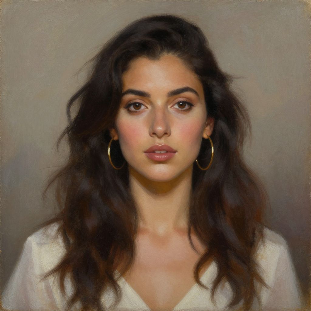 This digital painting portrays a young woman with olive skin and dark, wavy hair that falls past her shoulders. She has large, expressive brown eyes, well-defined eyebrows, and full lips with a subtle pink hue. She wears large, gold hoop earrings and a white, V-neck top. The background is a neutral, gradient gray, allowing her face to be the focal point. The painting uses a realistic style with soft, blended brushstrokes, highlighting her natural beauty and calm expression. Her gaze is direct and slightly serious, adding an introspective quality to the portrait.