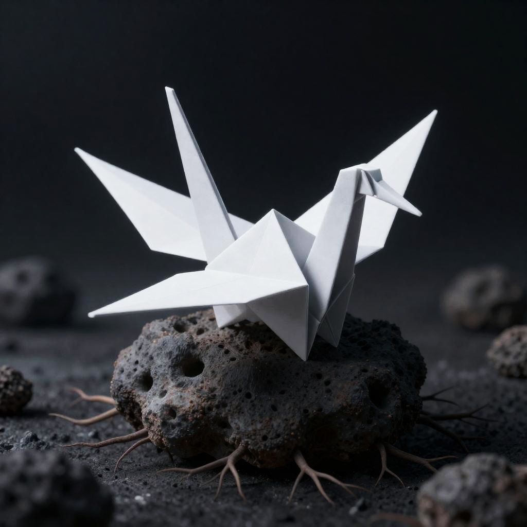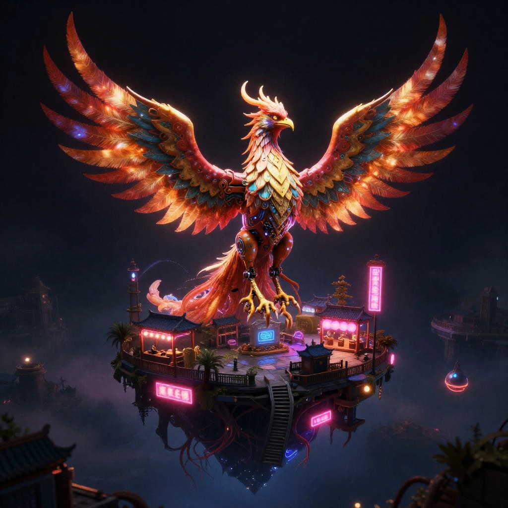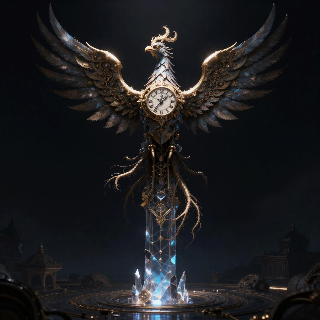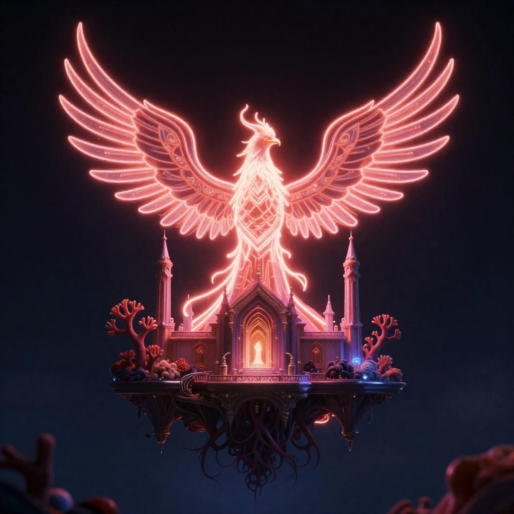 A stunning crystalline phoenix on a suspended glass atrium surrounded by an infinite void. The scene features intricate details, with roots extending into the darkness, depicted in a highly detailed, HD cyberpunk anime style against a dark atmospheric sky.