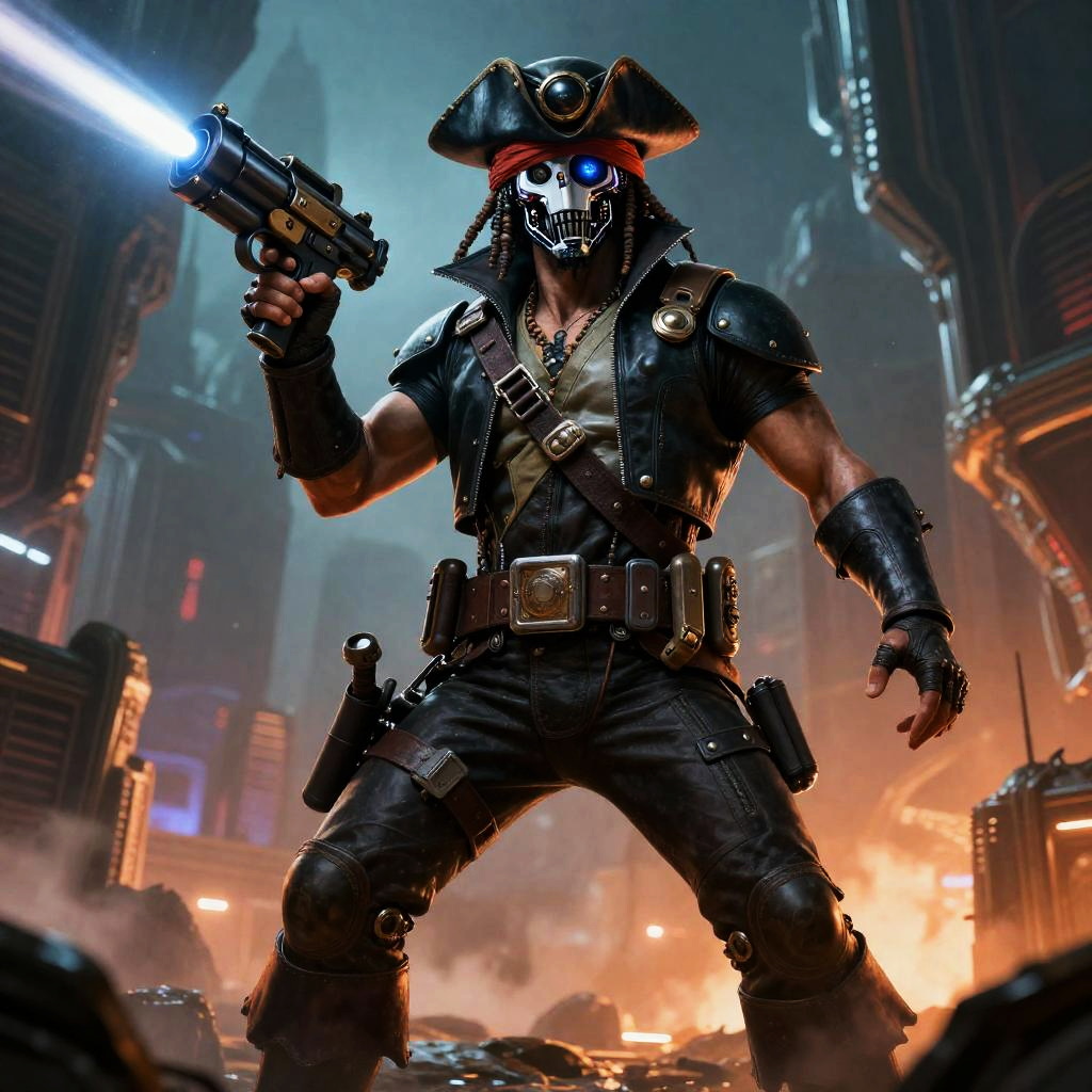 Realistic photo.A depiction of a daring space pirate, equipped with a plasma blaster and a cybernetic eye, in a vibrant alien city, inspired by H.R. Giger, detailed linework, bold color palette, dynamic pose realistic photo