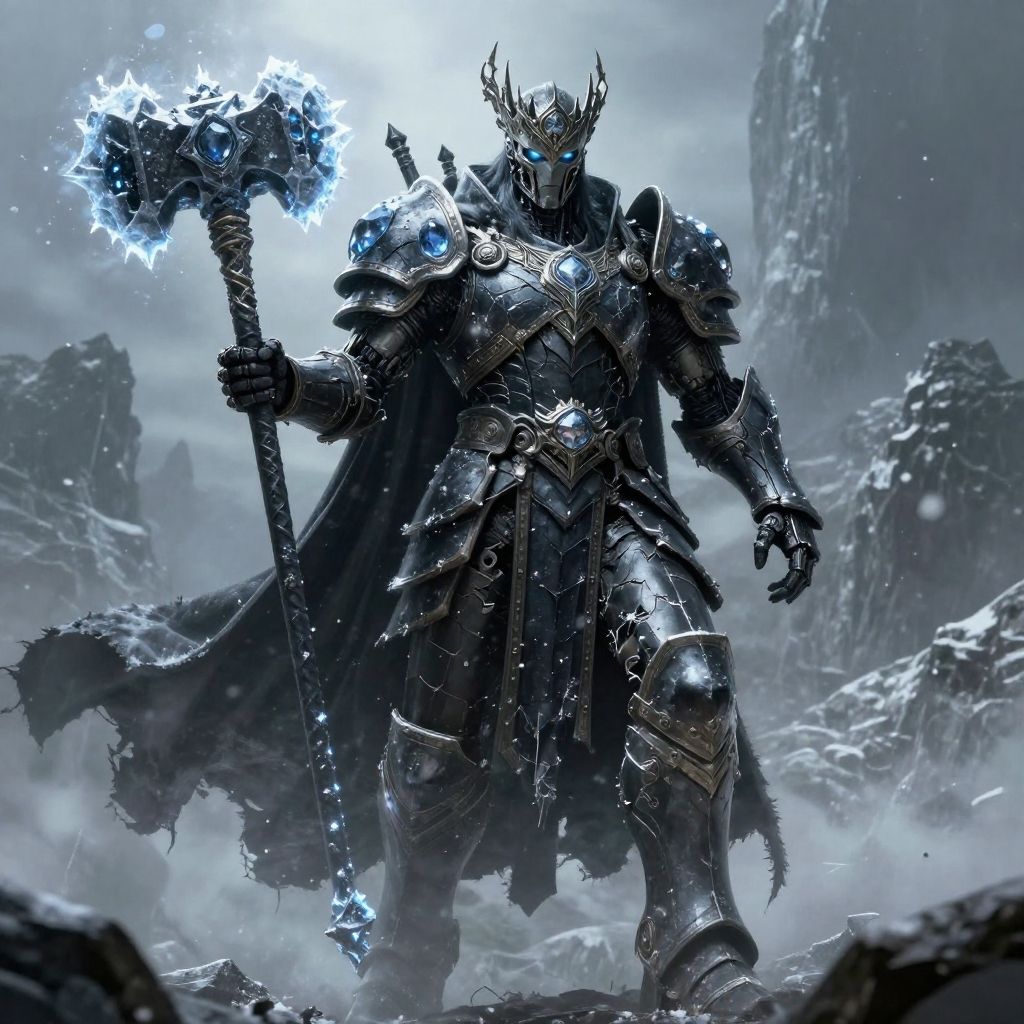 Digital artwork depicting a fearsome, armored warrior with a crown-like helmet, glowing blue eyes, and intricate dark metal armor. He wields a large, glowing blue axe in his right hand and has a matching blue orb on his left shoulder. The background features a snowy, rocky landscape with towering, jagged mountains under a cloudy, icy sky. The warrior's cape flows dramatically, adding to his imposing presence. The overall color palette is dark and icy, emphasizing the cold, mystical atmosphere. The image has a high-fantasy, epic style.