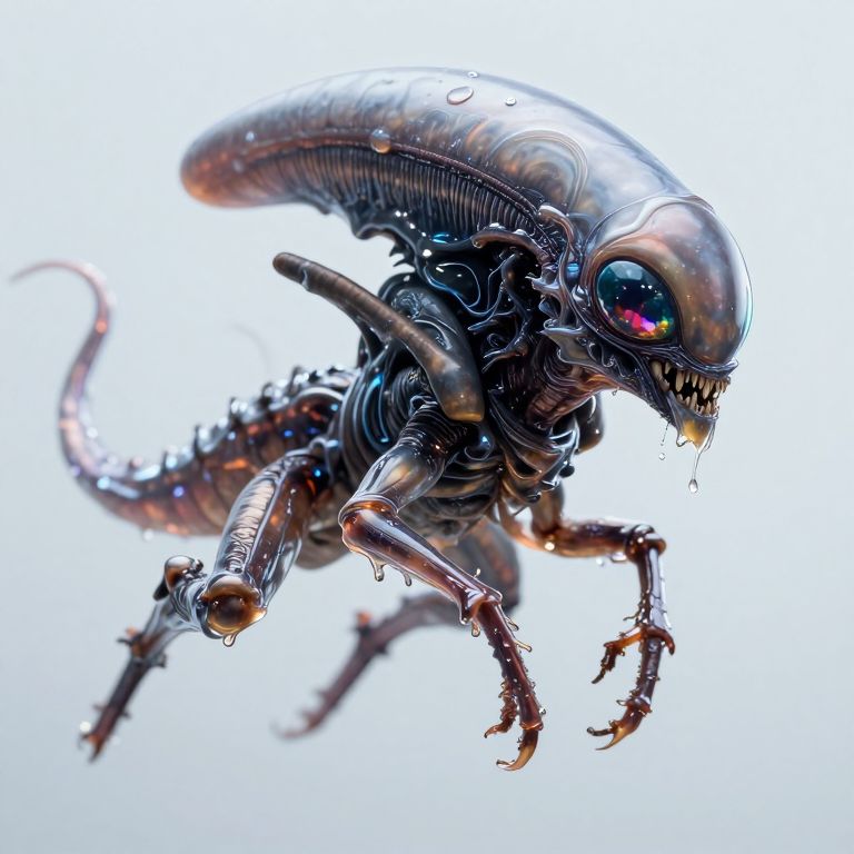 A close-up view of a bizarre insectoid alien, its segmented, metallic exoskeleton seemingly melting into a semi-liquid form, glistening with a wet, organic sheen, Strange, fluid-like patterns ripple across its armor, as if alive, shifting and rearranging, Its twitching mandibles drip with a thick, translucent gel, while its multifaceted eyes shimmer like liquid gemstones, constantly shifting and reforming, Thin tendrils of viscous ooze trail from its limbs, pulsating faintly as bioluminescent veins glow beneath the surface, suggesting a fluid, ever-changing structure, The alien's form seems both solid and formless, hovering between a creature of metal and living plasma
