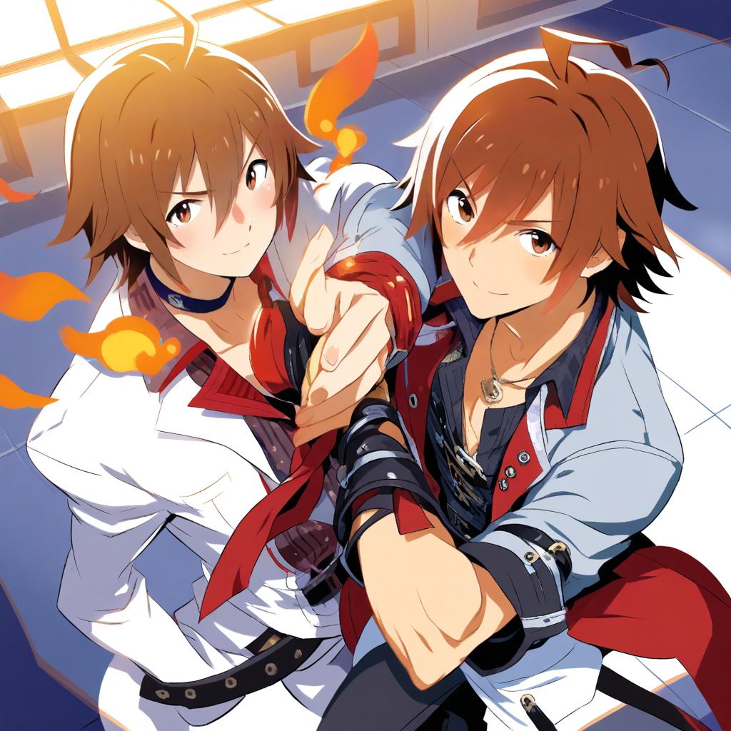 Digital anime-style illustration of two characters resembling Amagase Touma from The Idolmaster series. Both characters have brown hair with ahoge, brown eyes, and are dressed in stylish, colorful stage outfits with accessories including belts and necklaces. The scene has dynamic lighting with warm highlights.