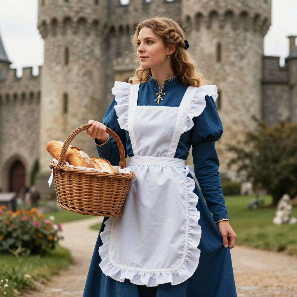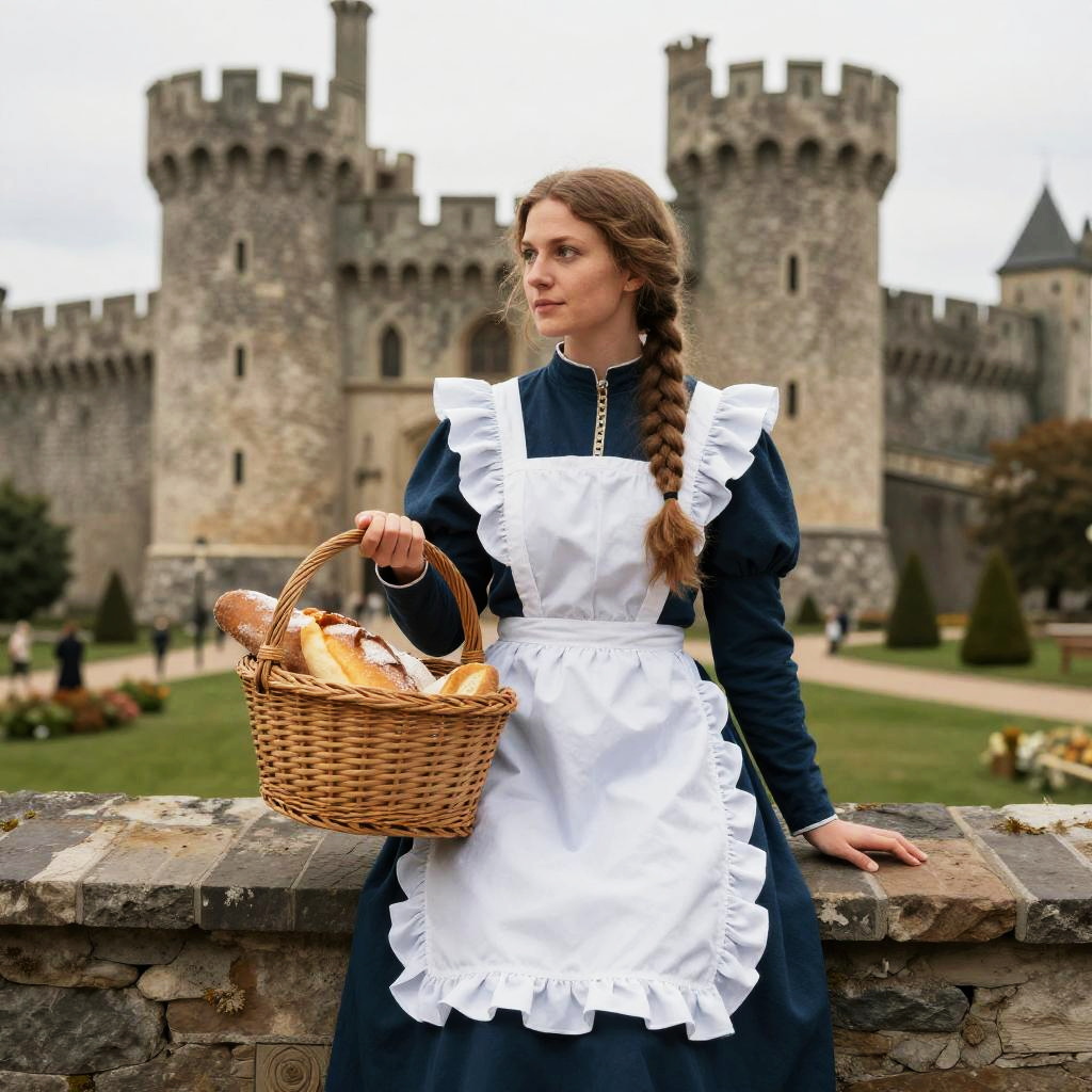 Young woman in a medieval maid outfit with a long braid, wearing a dark blue dress and white apron with ruffles, holding a wicker basket filled with various types of bread. She is standing outdoors in front of a historic stone castle with towers, on a cloudy day.