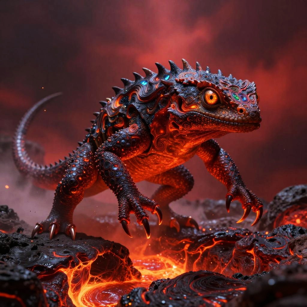 Ember-lizard creature with swirling magma patterns and jewel-like eyes, vaulting over lava fissures with glowing claws extended, molten riverbank under a stormy red-tinged sky, action shot, skin pores, very dark lighting, heavy shadows, detailed face, vibrant, photorealistic, dramatic, sharp focus, 8k, (intricate:1.4), decadent, (highly detailed:1.4), digital painting, concept art, octane render, artstation, smooth illustration, global illumination, studio light, volumetric light, atmospheric fog, particles floating, embers, wet surfaces, rim light, depth of field