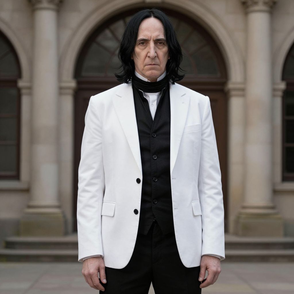 Snape Costume, man in a white jacket and black scarf standing in front of a building