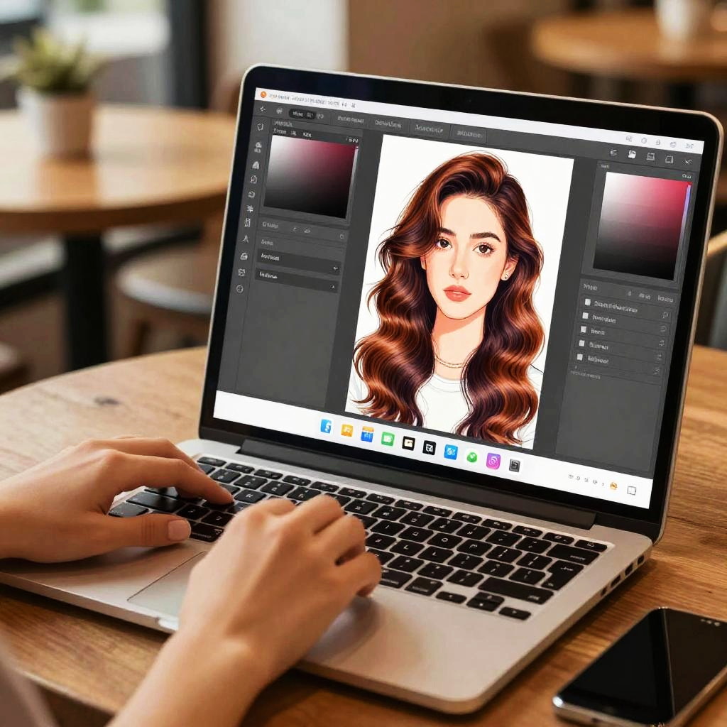 Photo hair color editor online free tool showcased on a laptop in a cozy cafe setting, diverse color palette visible, user adjusting vivid hair colors on a digital portrait, creative workspace vibe, warm lighting, detailed UI elements, realistic digital illustration