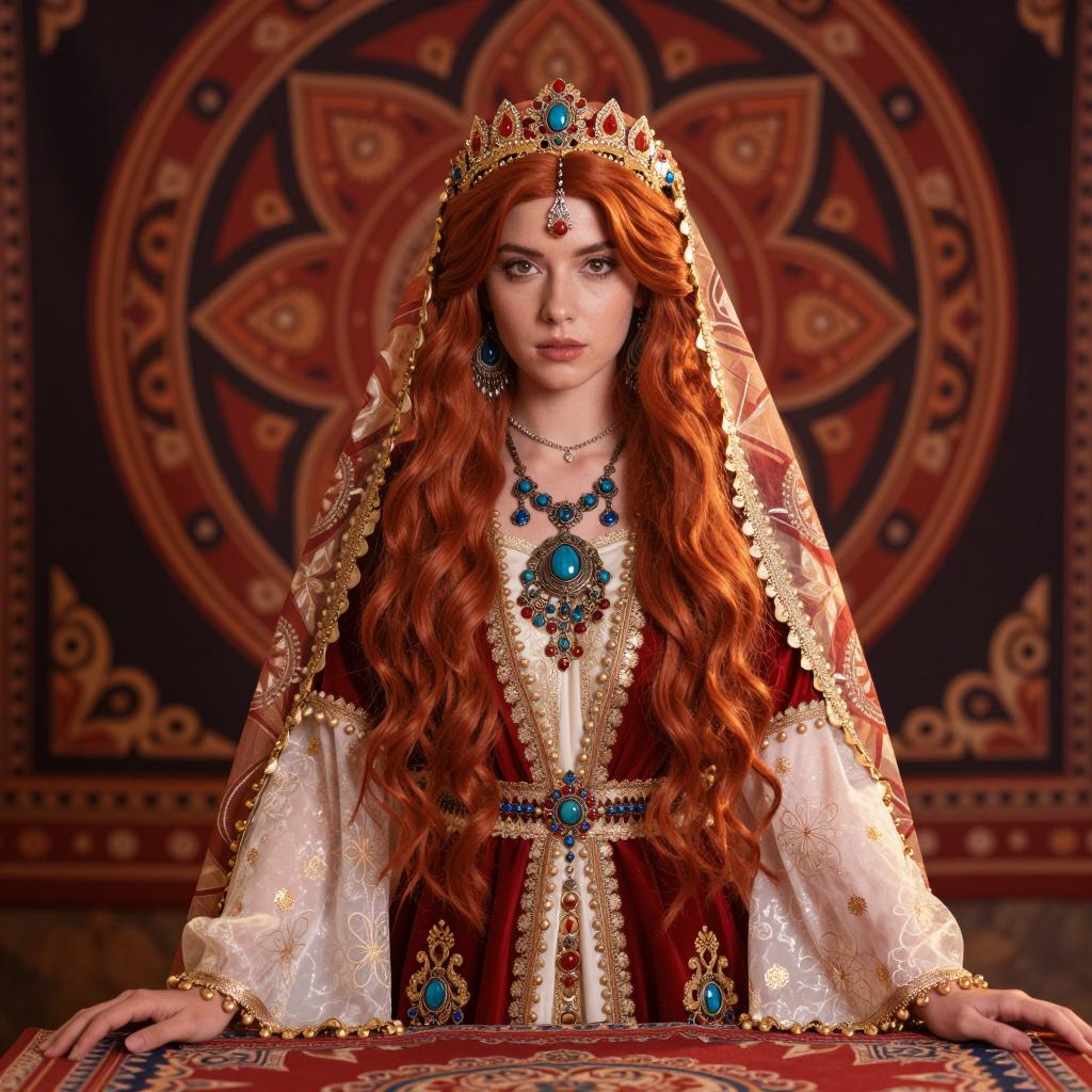 Traditional long gowns, photorealistic, young woman, Middle Eastern costume, detailed embroidered dress, long braids, gold headpiece, ornate earrings, tan robe with colorful patterns, standing in sunlit courtyard, blurred background with people, daytime, historical setting, soft lighting, high detail, realistic ures, fantasy inspired, elegant, traditional attire