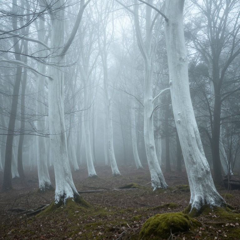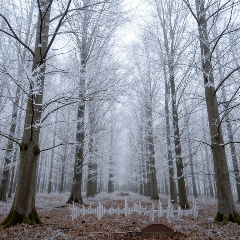 Photograph of a winter forest scene. Tall, leafless trees with dark brown trunks stand in a straight, symmetrical line, creating a tunnel-like effect. The tree branches are covered in delicate white frost. The ground is covered in a thin layer of frost and brown fallen leaves. In the foreground, a white picket fence runs horizontally, partially obscured by the trees. The background is foggy, adding a mysterious, ethereal quality to the image. The overall color palette is cool, with whites, browns, and greys dominating the scene. The atmosphere is calm and slightly eerie.