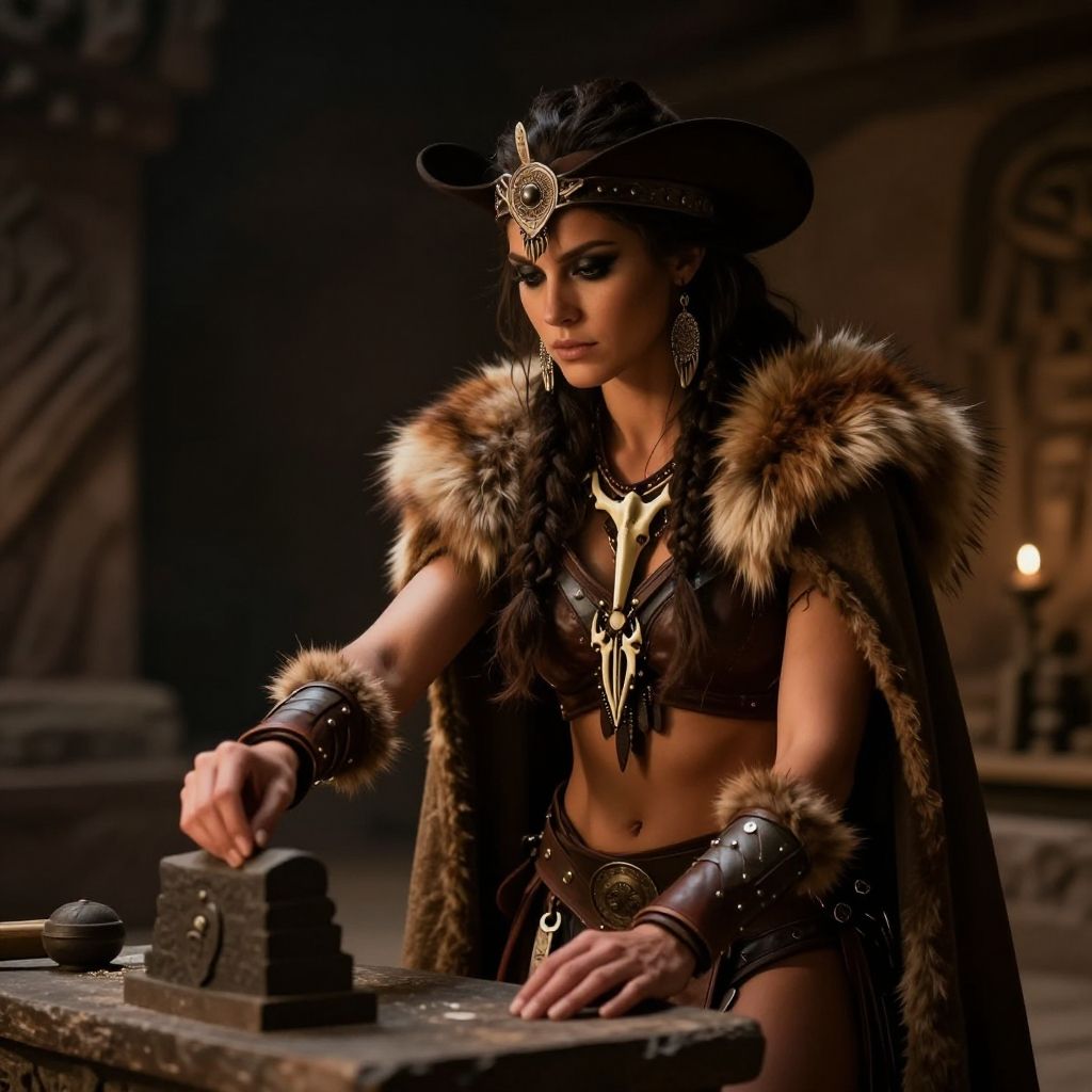 Photograph of a woman with olive skin and dark hair, styled in braids, wearing a black cowboy hat adorned with a gold crescent moon. She has dramatic dark eye makeup and wears a fur-trimmed black leather vest over a black bikini top, with matching fur-trimmed arm cuffs and a fur cape. She has a gold necklace with a jaguar pendant. She is seated at a wooden workbench, touching a black metallic object. The background is a dimly lit, rustic room with wooden textures and soft, warm lighting. The overall aesthetic is Western fantasy.