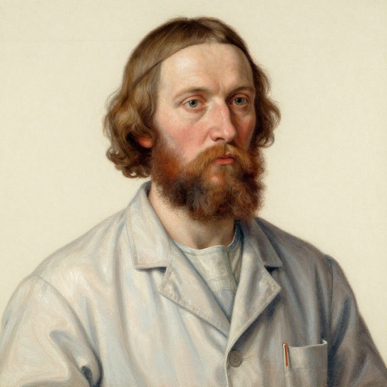 Realistic digital painting of a bearded Caucasian man with wavy brown hair, wearing a light gray lab coat, against a white background.