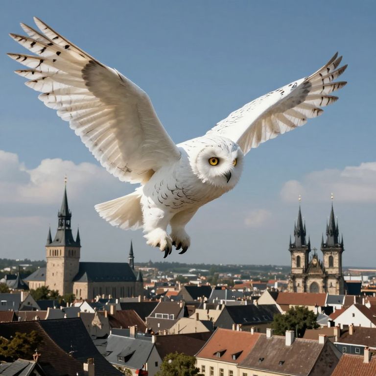 Colossal white owl spreads its wings majestically above a medieval cityscape, its piercing golden eyes surveying the intricate network of spires and towers that nestle beneath its shadow.