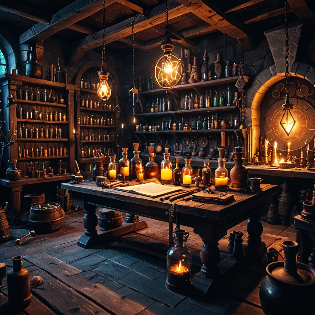 A dimly lit fantasy arcane workshop filled with glowing potion bottles and enchanted tools on wooden shelves and tables. Warm light from candles and magical floating lanterns illuminate the rustic stone and wooden interior, featuring shelves stocked with alchemical ingredients and ancient books. The setting evokes a mystical atmosphere perfect for potion making and spell crafting.