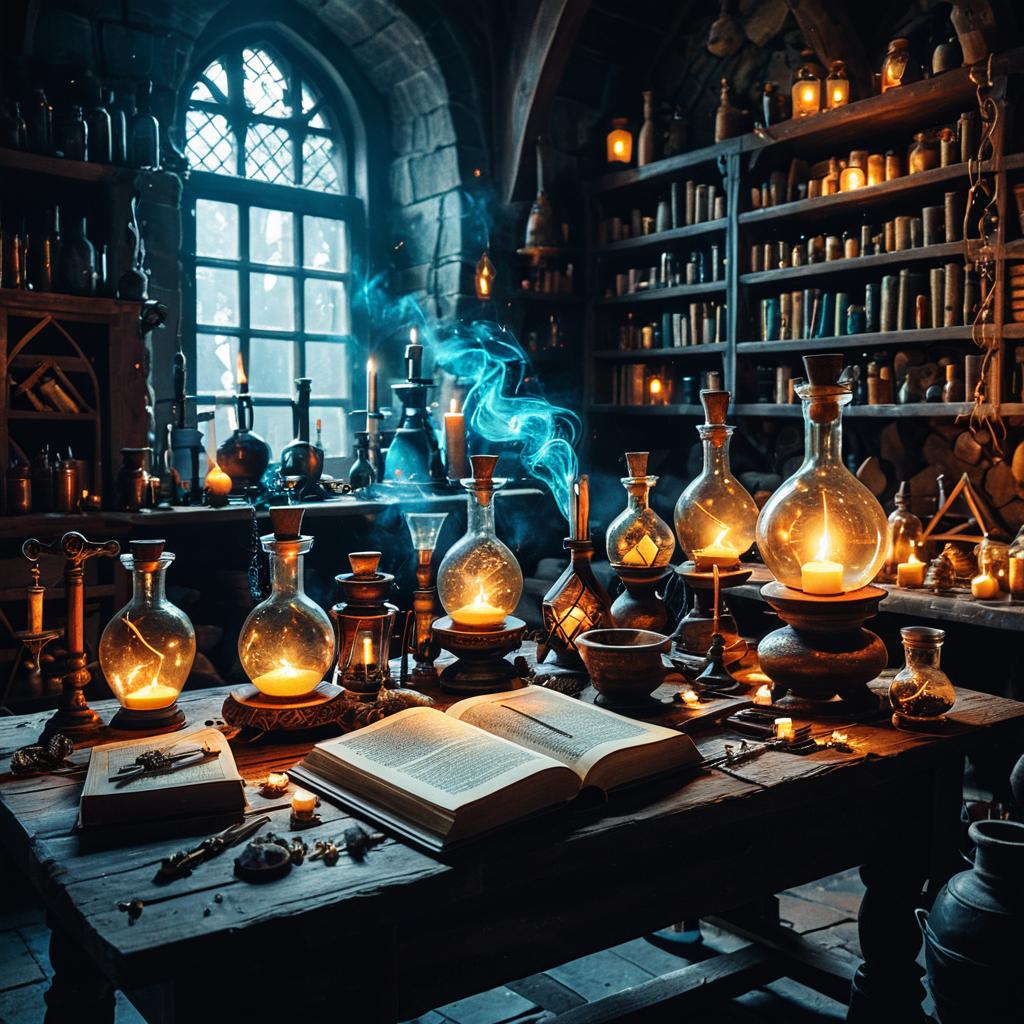 Fantasy concept art of a arcane workshop with potion bottles, floating scrolls, enchanted tools, glowing runes, warm alchemical light.