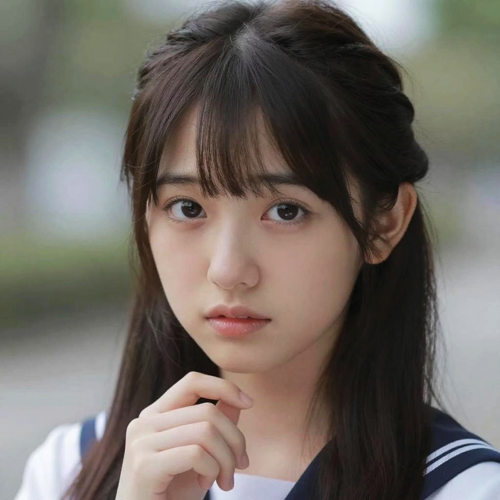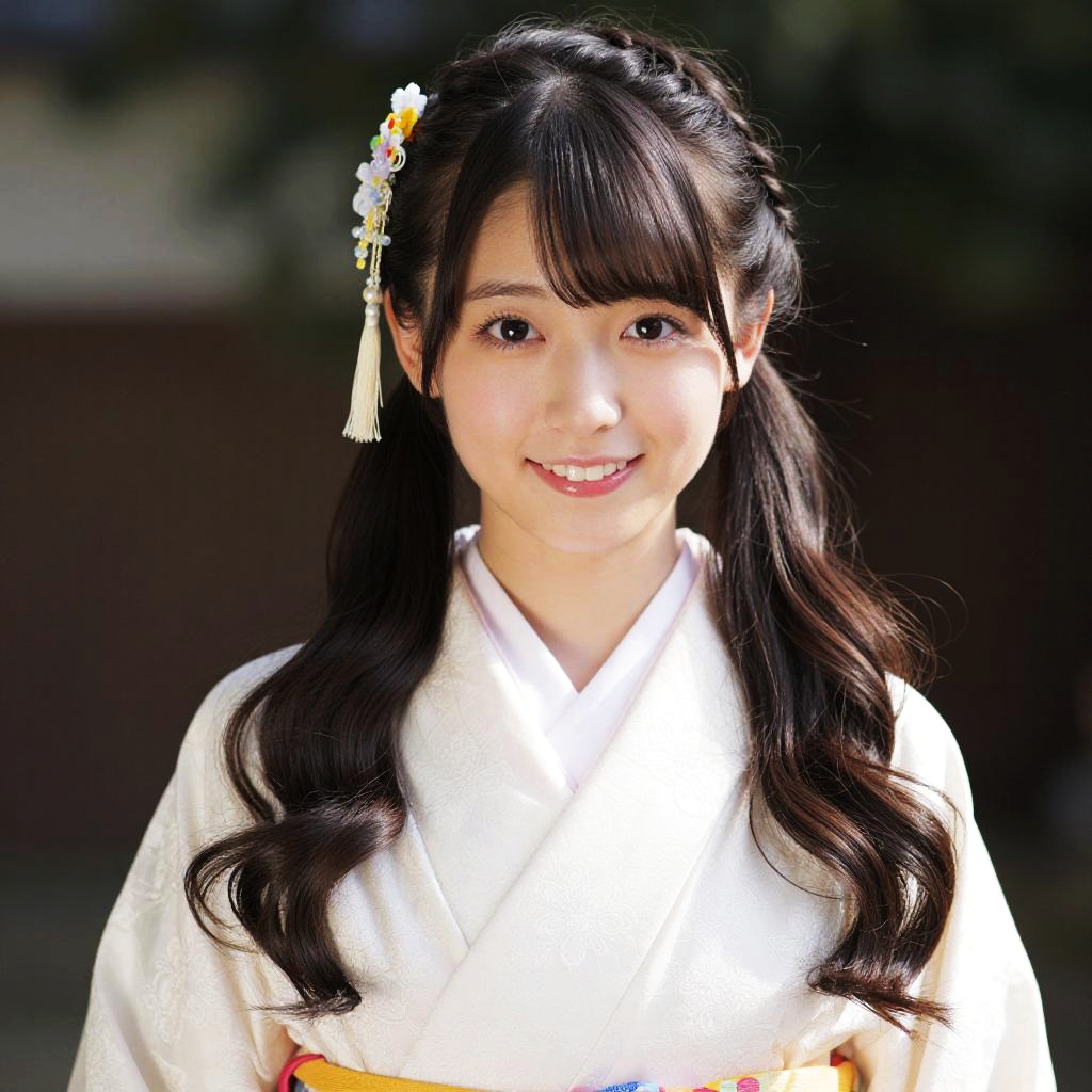Photograph of a young Japanese woman with long, wavy black hair adorned with a white and yellow floral hairpin. She has fair skin, large dark eyes, and a gentle smile. She wears a traditional white kimono with subtle red accents. The background is blurred, featuring dark greens and browns, suggesting an outdoor setting. The lighting highlights her face and hair, creating a soft, natural glow. Her hair is styled in two low pigtails, adding a touch of traditional elegance. The overall composition emphasizes her serene, traditional beauty.