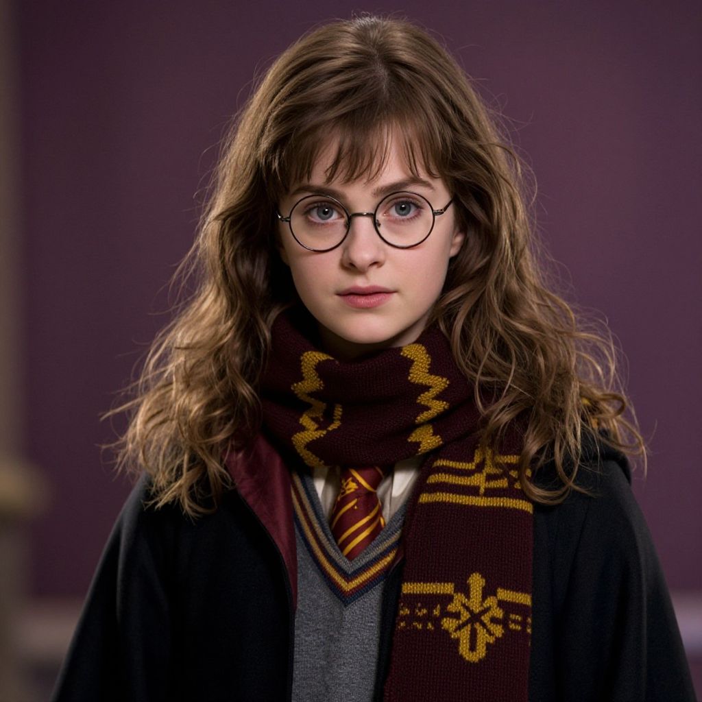Photograph of a young Caucasian girl with fair skin and wavy brown hair, wearing round glasses and a Hogwarts-style school uniform. She has a serious expression and is adorned with a dark maroon scarf featuring yellow patterns, and a gray V-neck sweater with a striped tie. She wears a black robe over her uniform, reminiscent of Harry Potter's attire. The background is a blurred, dark purple, focusing attention on her face and upper body. The lighting highlights her face and hair, adding a soft glow to her features.