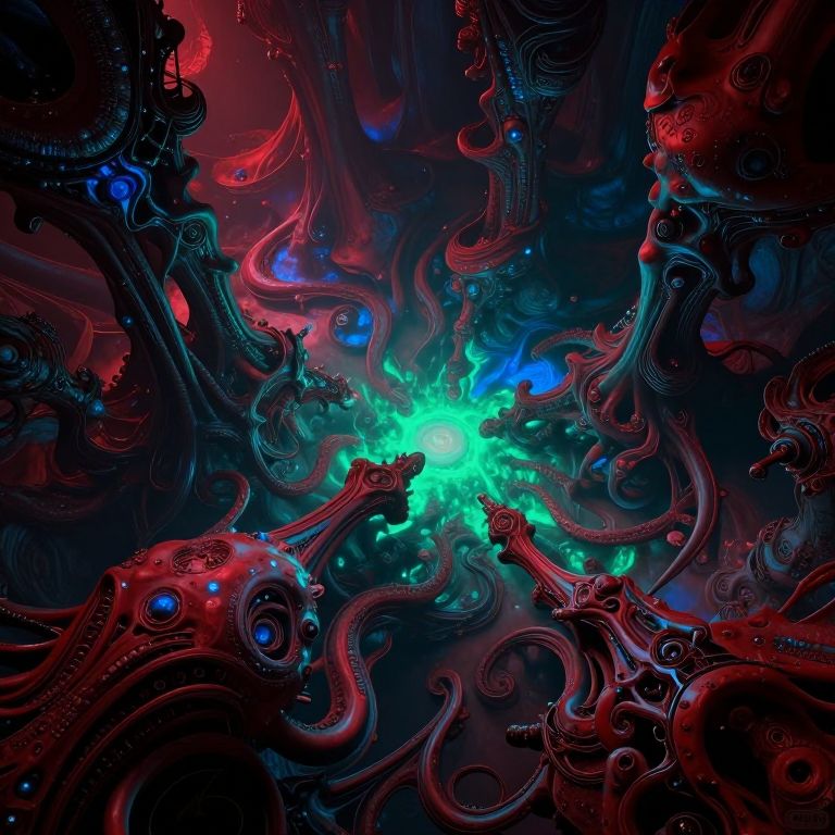 A captivating digital artwork unveils an enigmatic realm where organic forms intertwine with mechanical elements, reminiscent of the mesmerizing fusion found in H.R. Giger's iconic creations. From above, a surreal panorama unfurls, revealing twisting structures that merge into an otherworldly landscape, evoking both awe and unease. The scene's predominant colors shift from deep reds to glowing blues and neon greens, casting an ominous atmosphere upon the intricate textures adorning these alien entities. This piece masterfully balances surrealism with hyper-realism, inviting viewers into a mysterious world teeming with unexplored wonders.