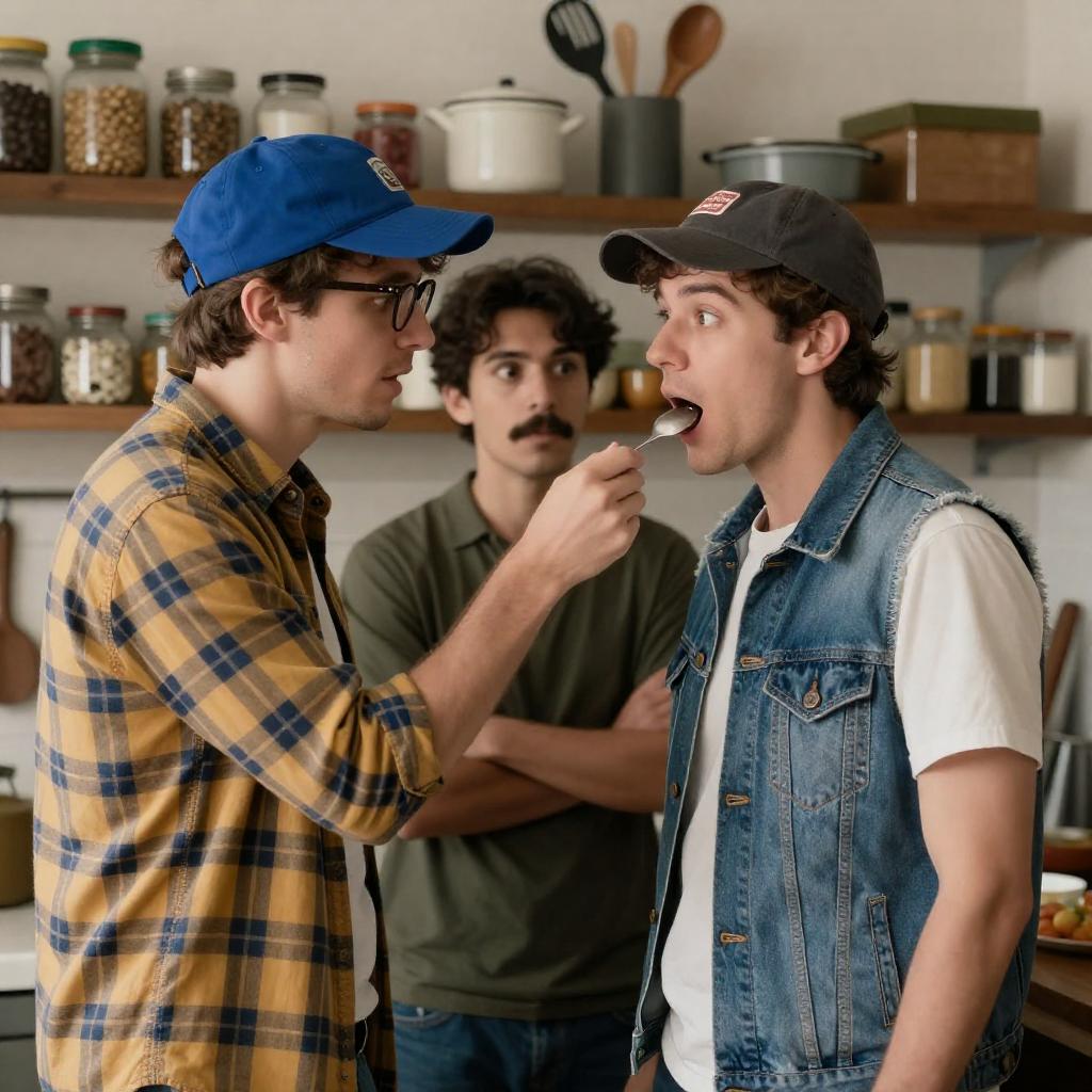 Photograph of three men in a cluttered kitchen. A man in a blue cap and glasses, wearing a yellow plaid shirt, feeds a surprised man in a denim vest and cap with a spoon. Another man with a mustache, in a green shirt, holds the spoon. Background includes shelves with jars and kitchen utensils.