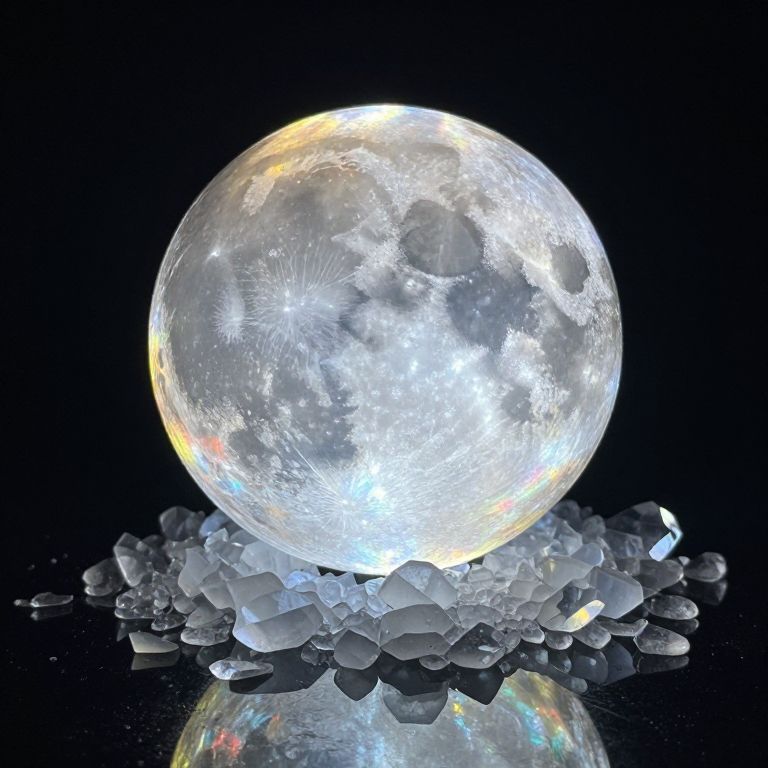 Radiant moon sphere, encrusted with icy textures and illuminated by vibrant rainbow hues, rests atop a scattering of translucent crystal fragments, casting a mesmerizing glow against a dark, reflective surface.