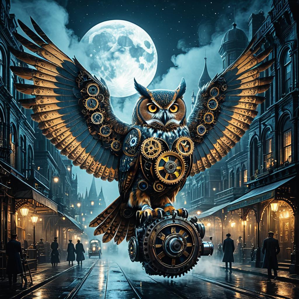Lowbrow art of an owl with a detective hat and magnifying glass, influenced by Boris Vallejo and Dr. Seuss, with a foggy Victorian street, funky and vibrant colors, surreal atmosphere, detailed textures, whimsical and humorous