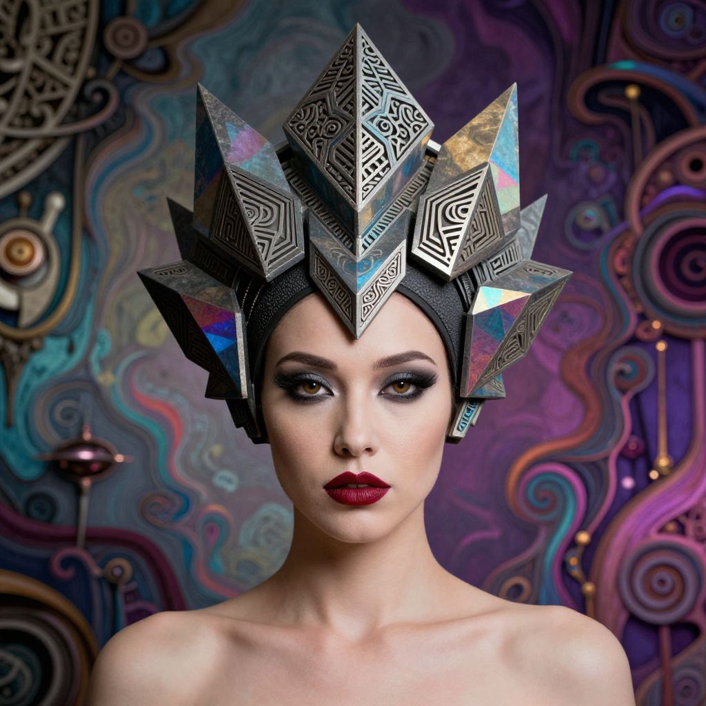 A woman in a futuristic, geometric headpiece with intricate patterns, set against a vibrant, abstract background with a mix of gothic, avant-garde, and surreal elements.