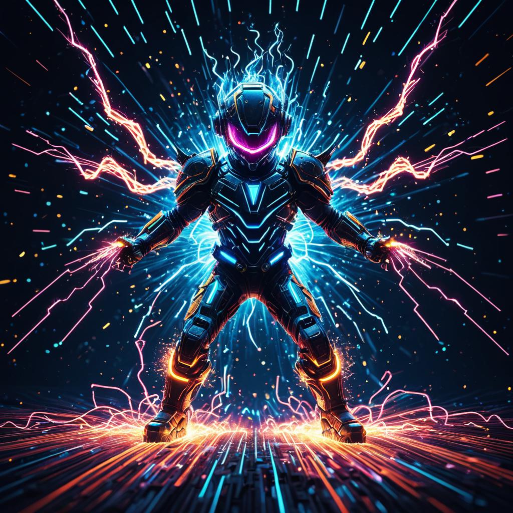 Highly detailed 8k digital artwork of a futuristic electric warrior figure surrounded by vibrant neon sparks and glowing trails. The humanoid character is clad in sleek, high-tech armor with bright neon accents and pulsing electric energy radiating from the body. The environment is dark, contrasting with the intense blue, pink, and orange electric sparks and light streaks, creating an energetic and dynamic sci-fi atmosphere.