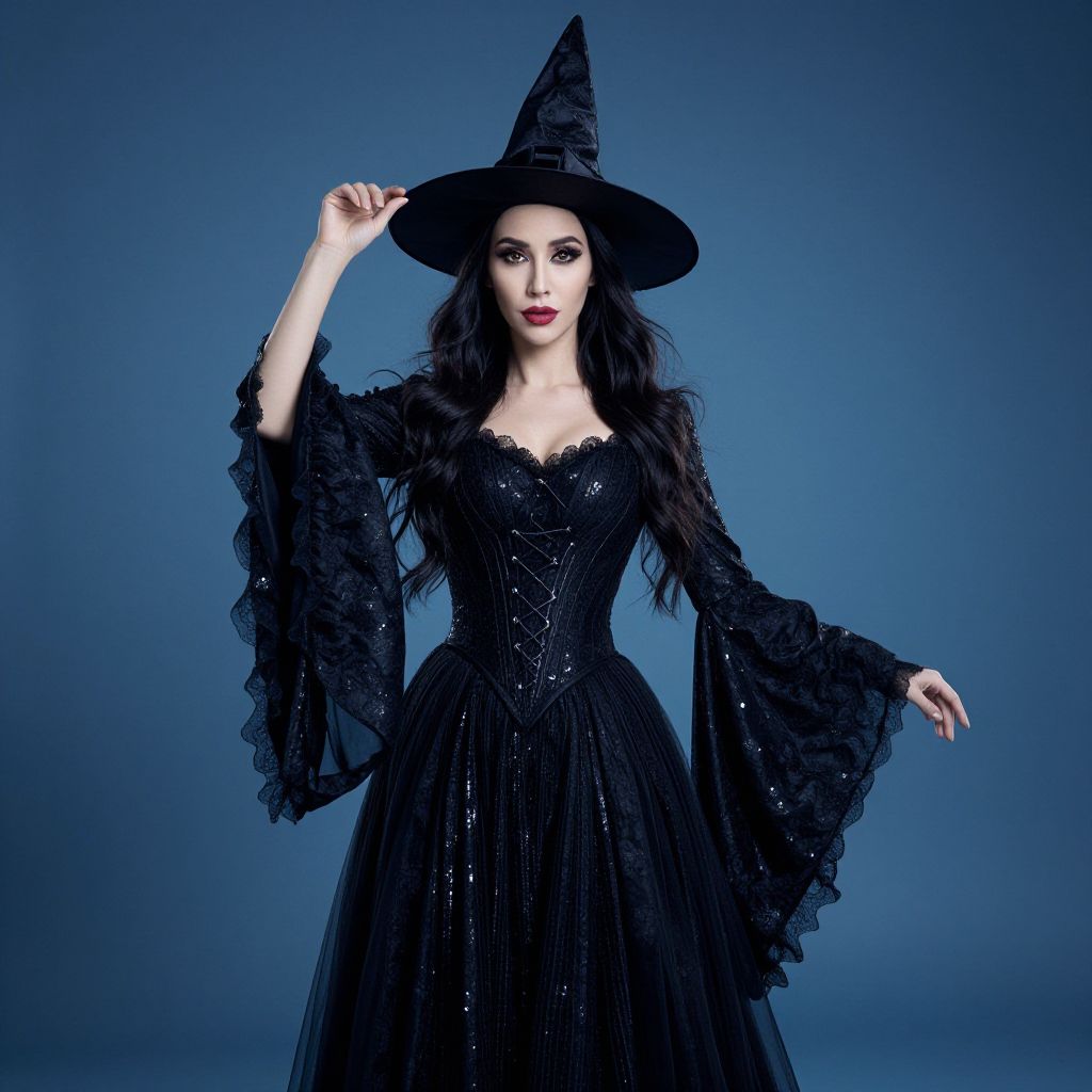 Photograph of a pale-skinned woman with long, wavy black hair, wearing a black, gothic-style witch costume. She has a tall, pointed black hat, and her dress is adorned with intricate lace and sparkling sequins, featuring long, flowing sleeves. Her red lipstick stands out against her white face makeup. She stands against a solid blue background, with one hand adjusting her hat and the other slightly raised. The image has a high-contrast, dramatic lighting style, emphasizing the dark, mysterious theme of her costume.
