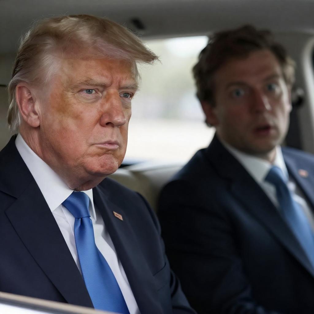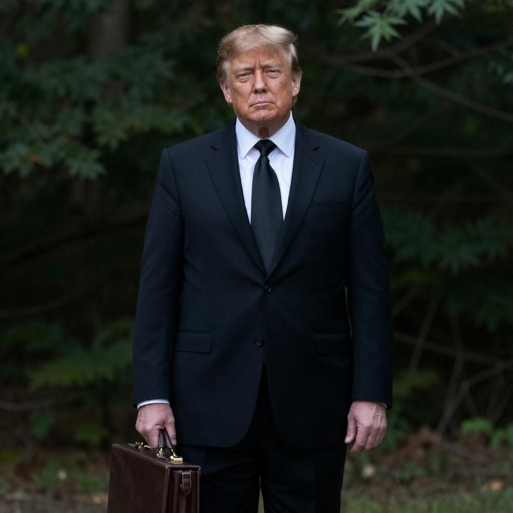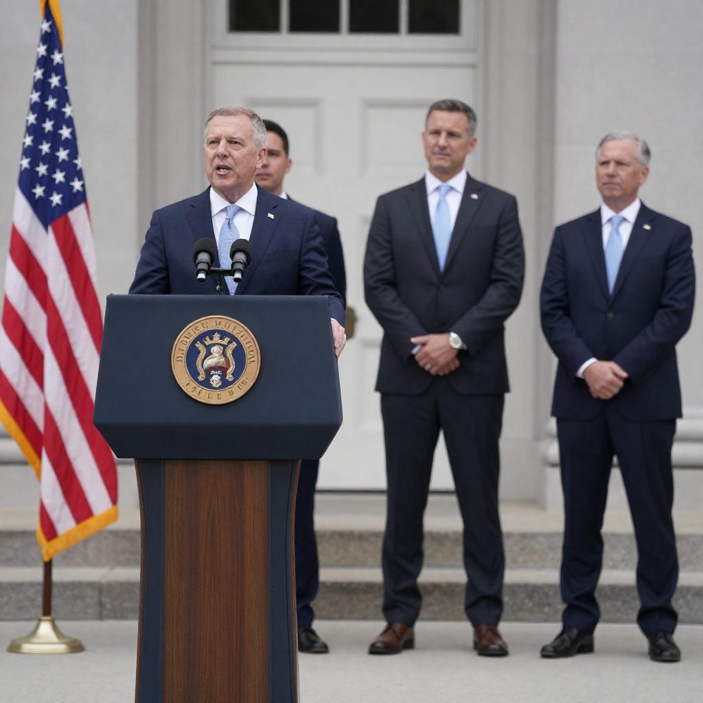 Photograph of an older white man with balding head and stern expression, standing behind a blue presidential seal podium, wearing a black suit and tie. Flanked by a white woman with shoulder-length brown hair and sunglasses on the left, and a white man in a gray suit with sunglasses on the right. Background shows a stone building entrance.